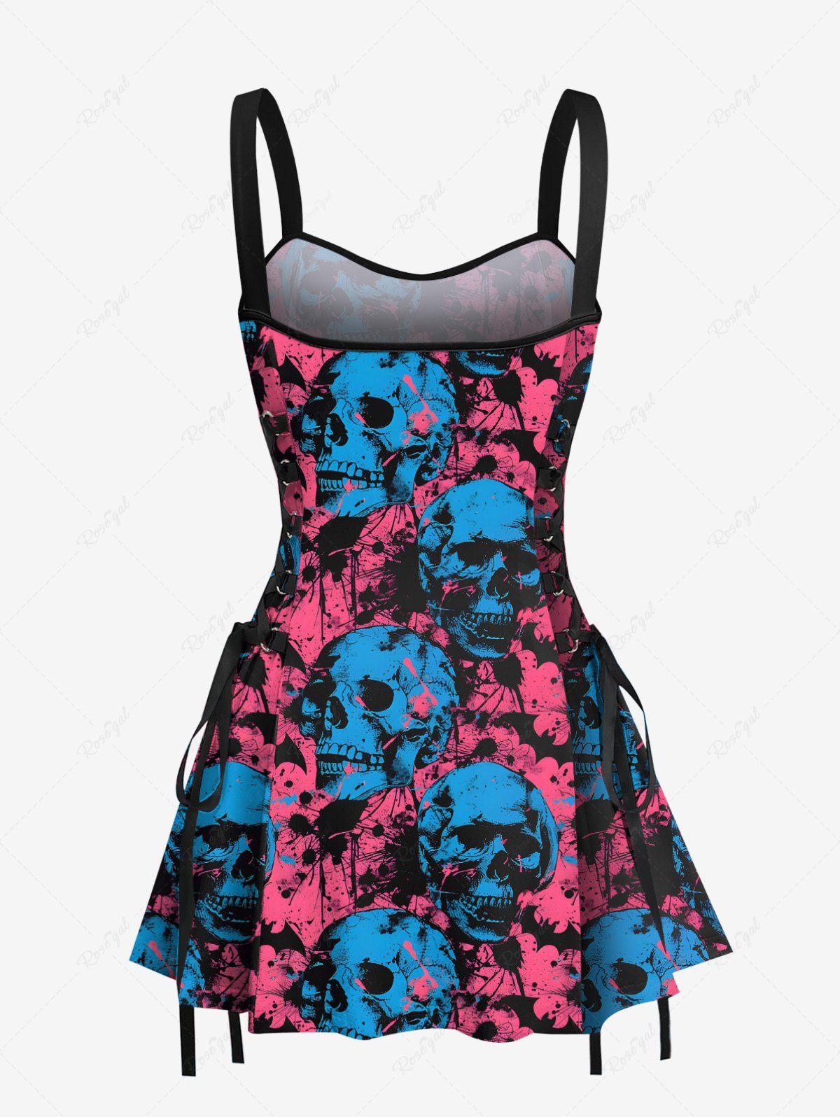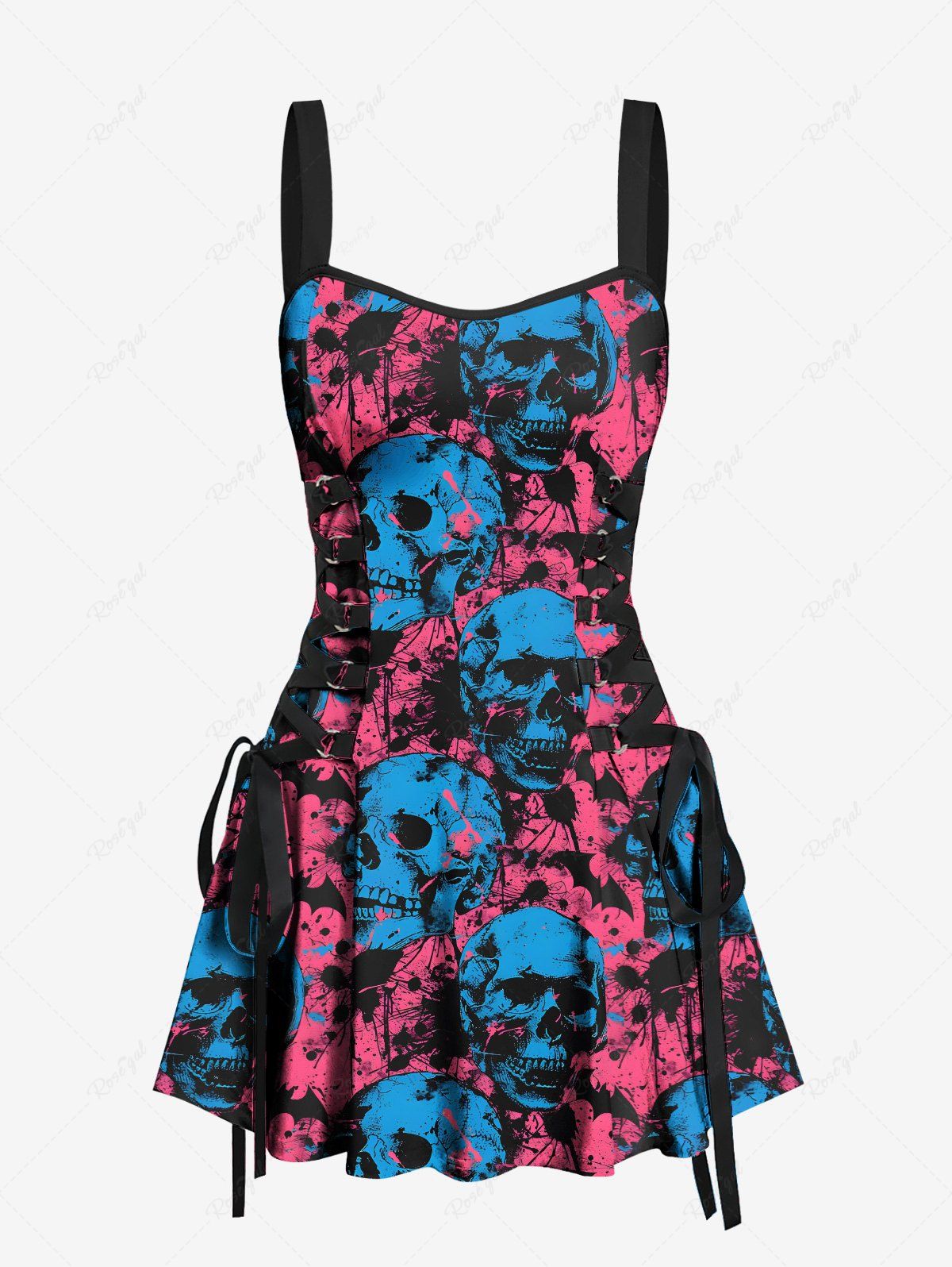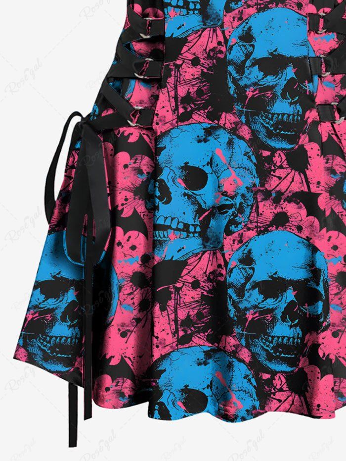 Gothic Ink Painting Skull Bat Print Halloween Lace Up A Line Tank Dress