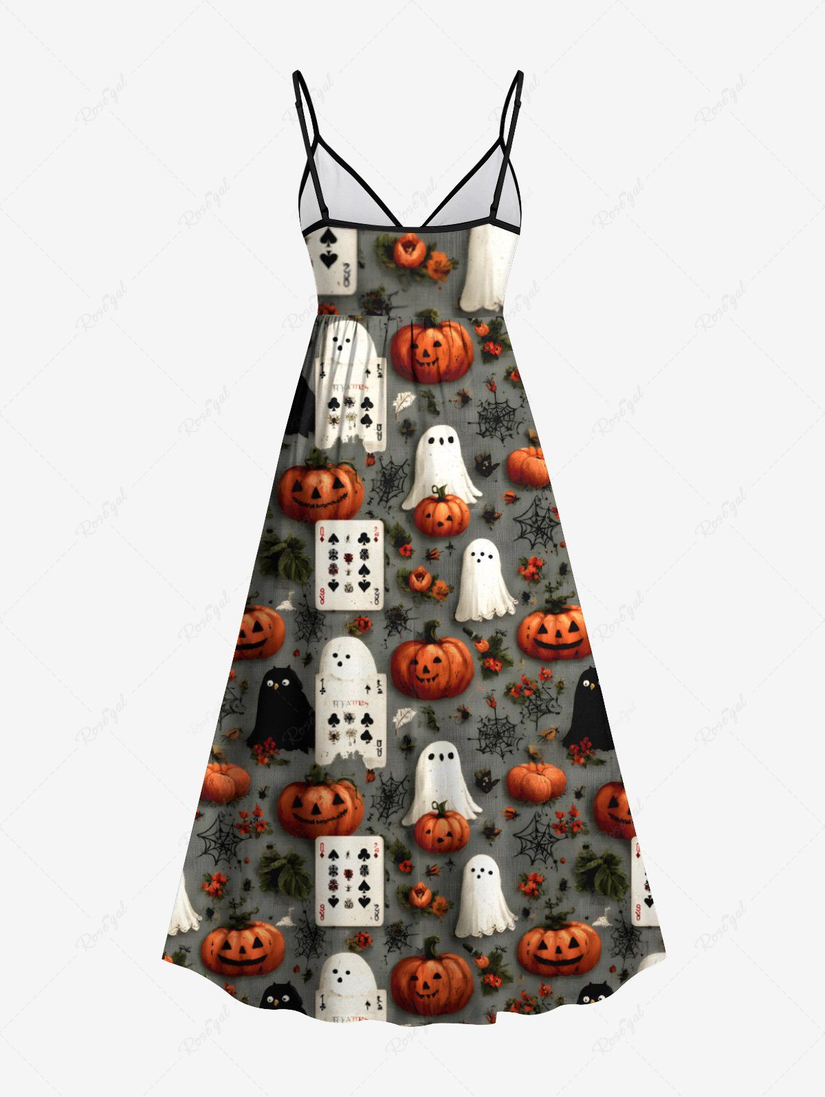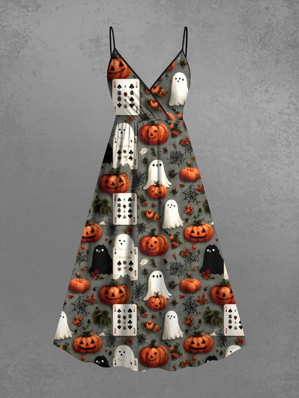 Gothic Plus Size Pumpkin Ghost Spider Web Poker Print Halloween Surplice A Line Cami Dress