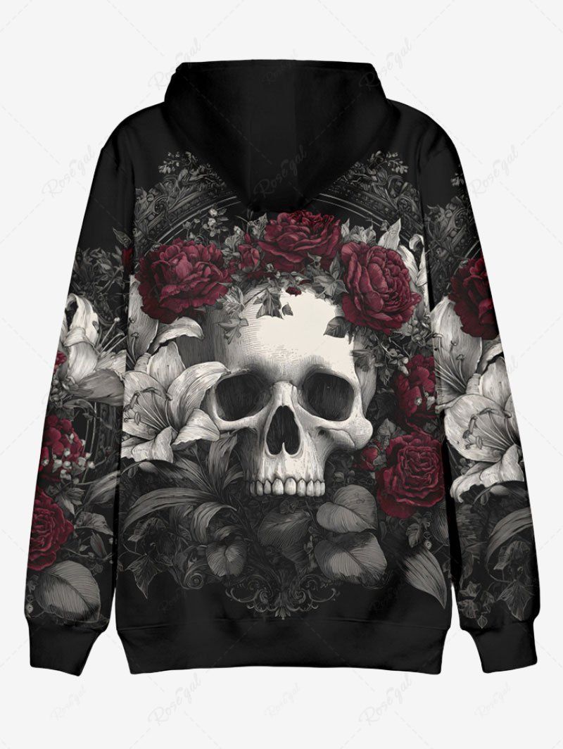Gothic Plus Size Skull Rose Flowers Print Drawstring Hoodie For Men