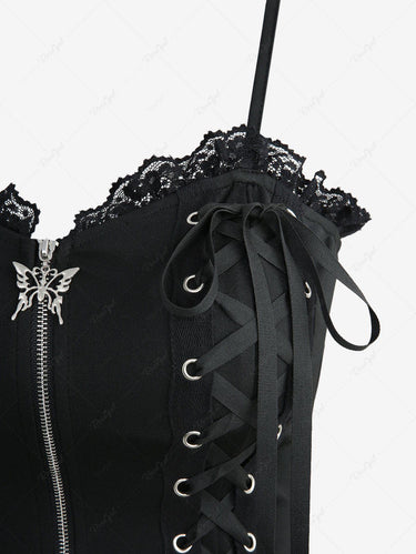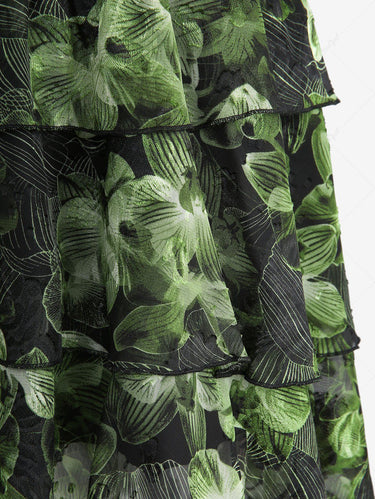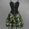 Gothic Floral Leaf Printed Lace Up Butterfly Zipper Lace-trim Layered High Low Asymmetric Cami Dress
