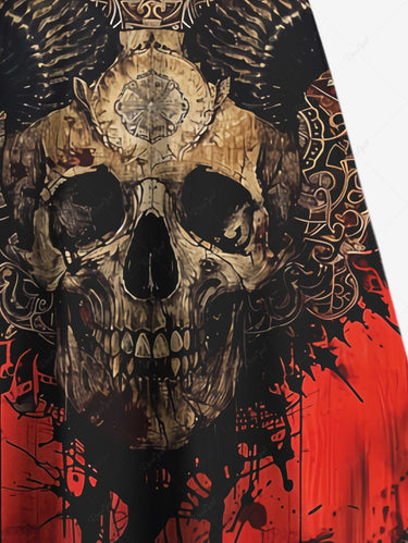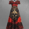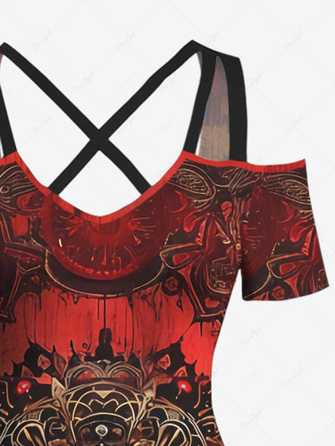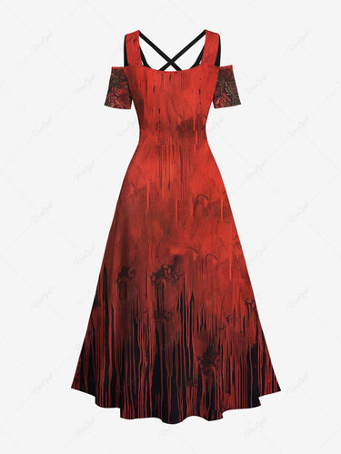 Gothic Plus Size Cold Shoulder Skull Horn Ink Painting Splatter Print Ombre Crisscross A Line Dress