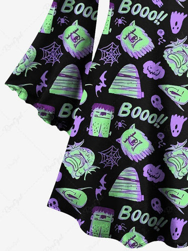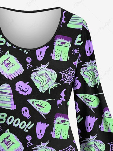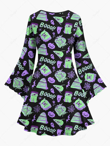 Gothic Plus Size Flare Sleeves Pumpkin Monster Spider Web Bat Mummy Skulls Dog Print A Line Dress