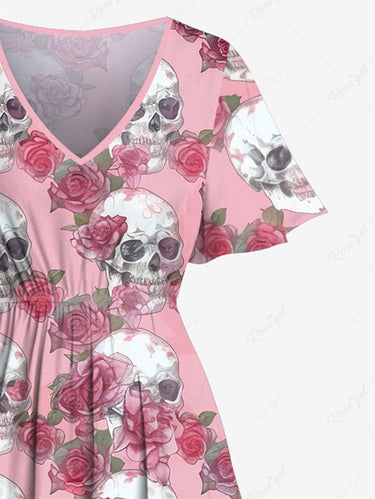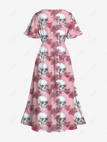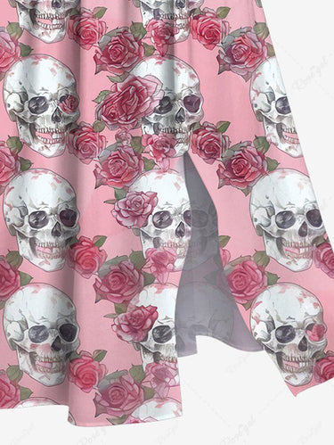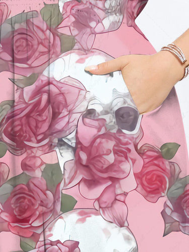 Gothic Plus Size Skull Rose Flower Leaf Print Split Pocket A Line Dress