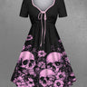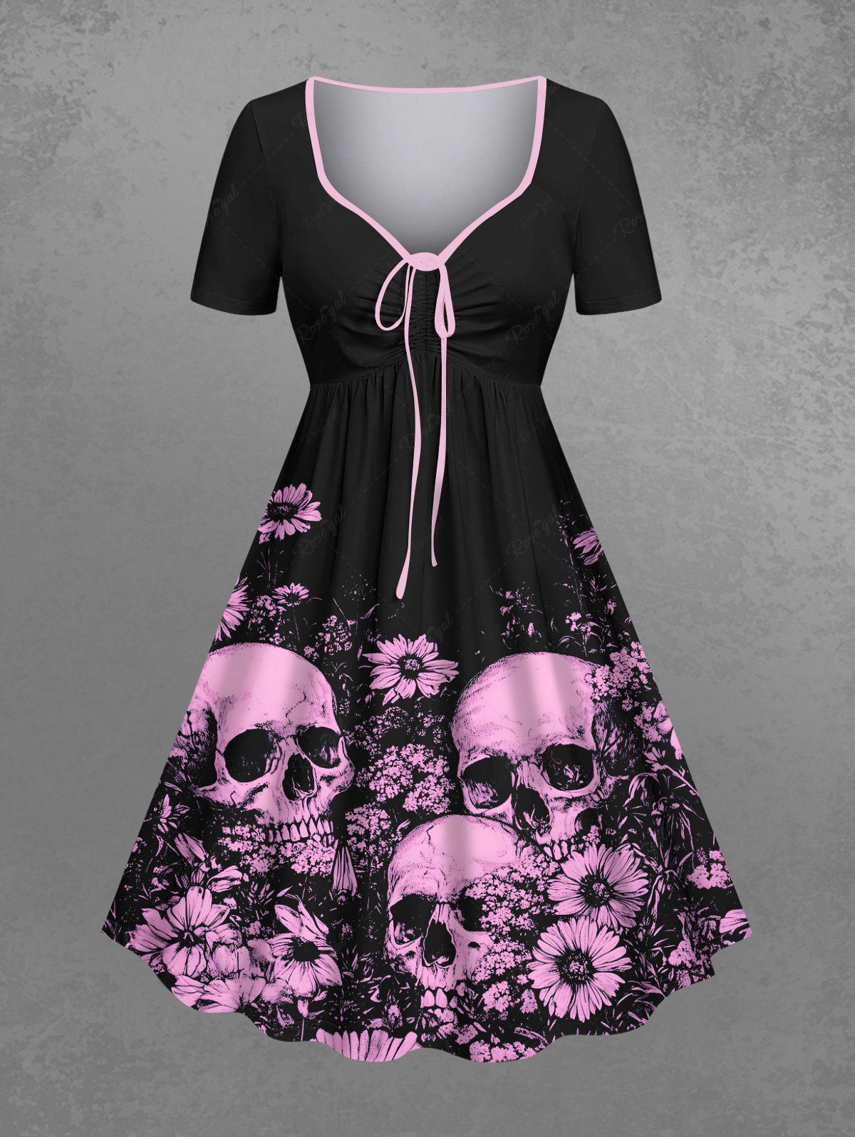 Gothic Plus Size Skull Daisy Flower Print Cinched A Line Dress