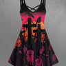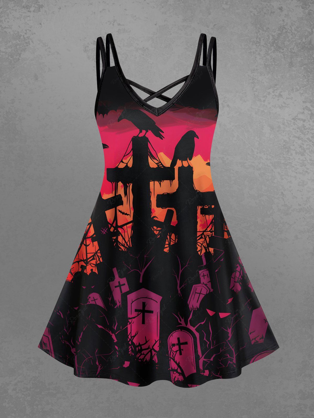 Gothic Plus Size Halloween Cross Tomb Crow Ombre Print Crisscross Cami Dress