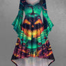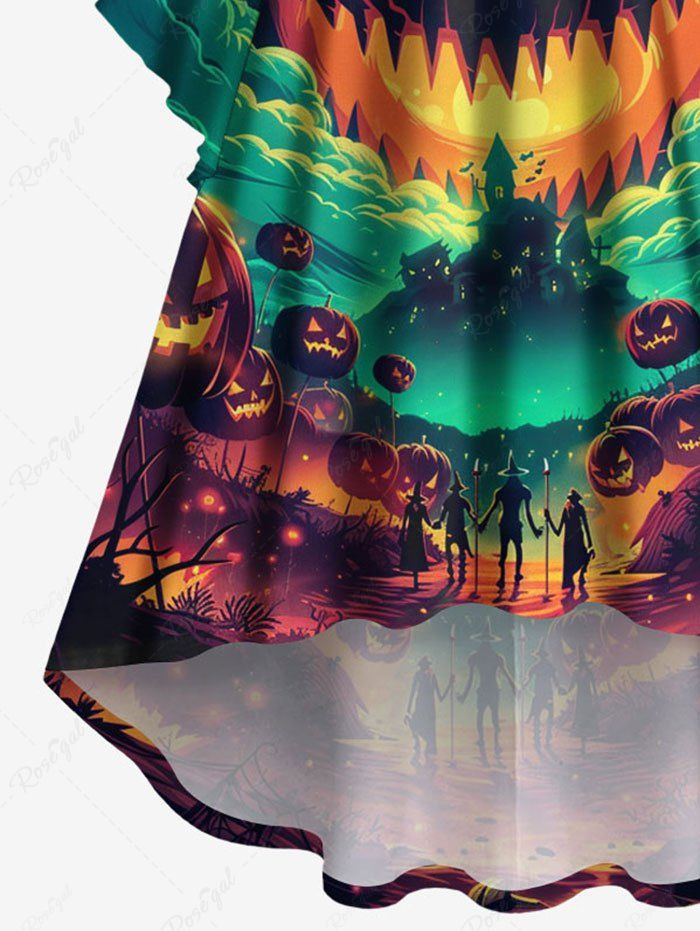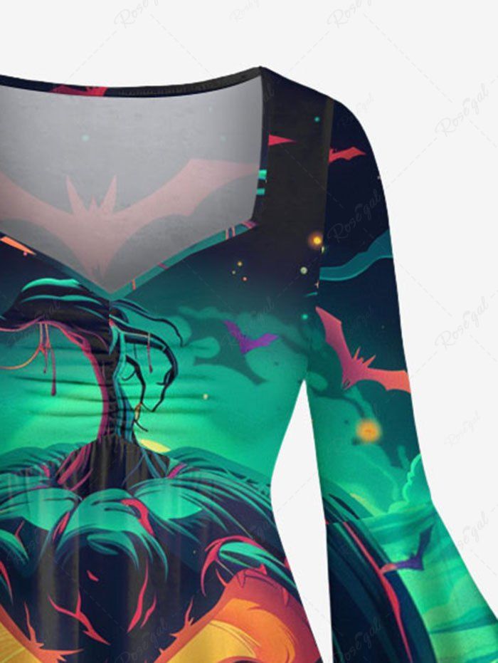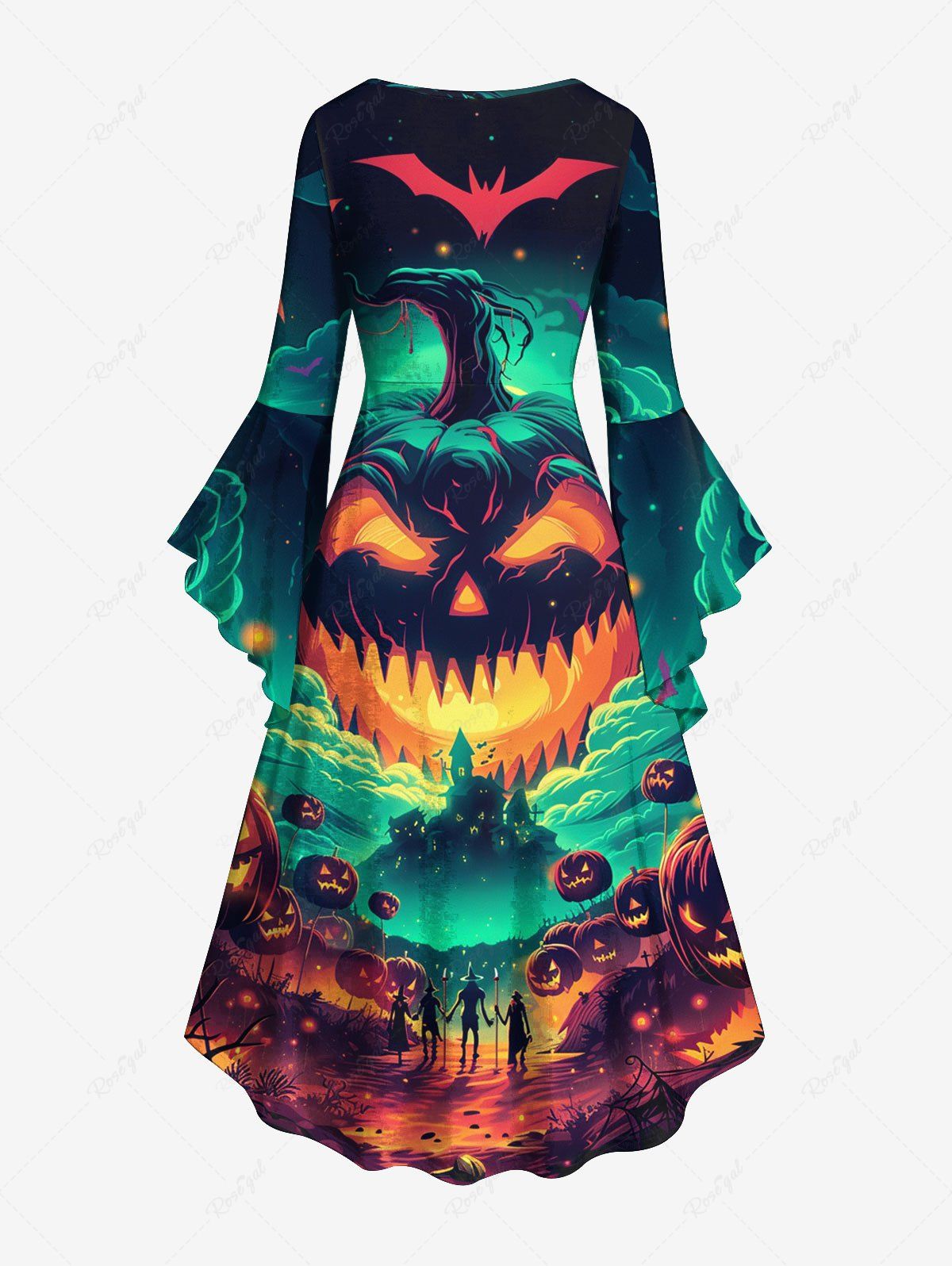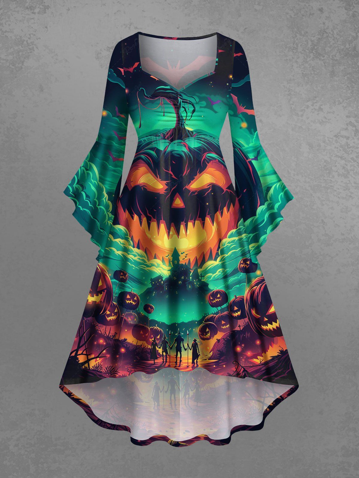 Gothic Plus Size Halloween Pumpkin Cloud Bat Print Ruched Flare Sleeves High Low Dress