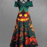 Gothic Plus Size Halloween Pumpkin Tree Print Cold Shoulder Crisscross Maxi Dress