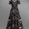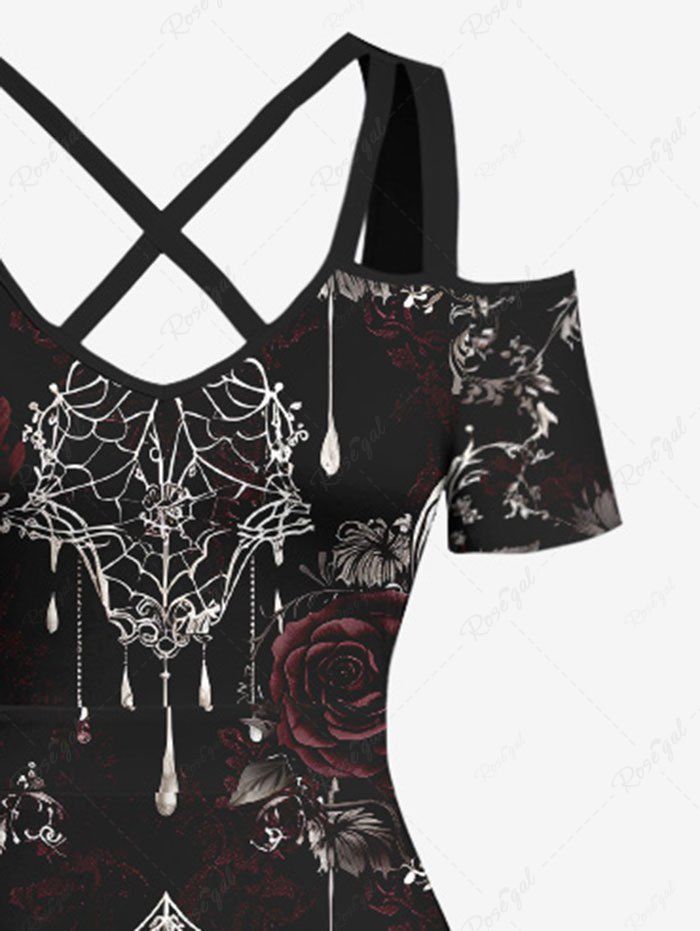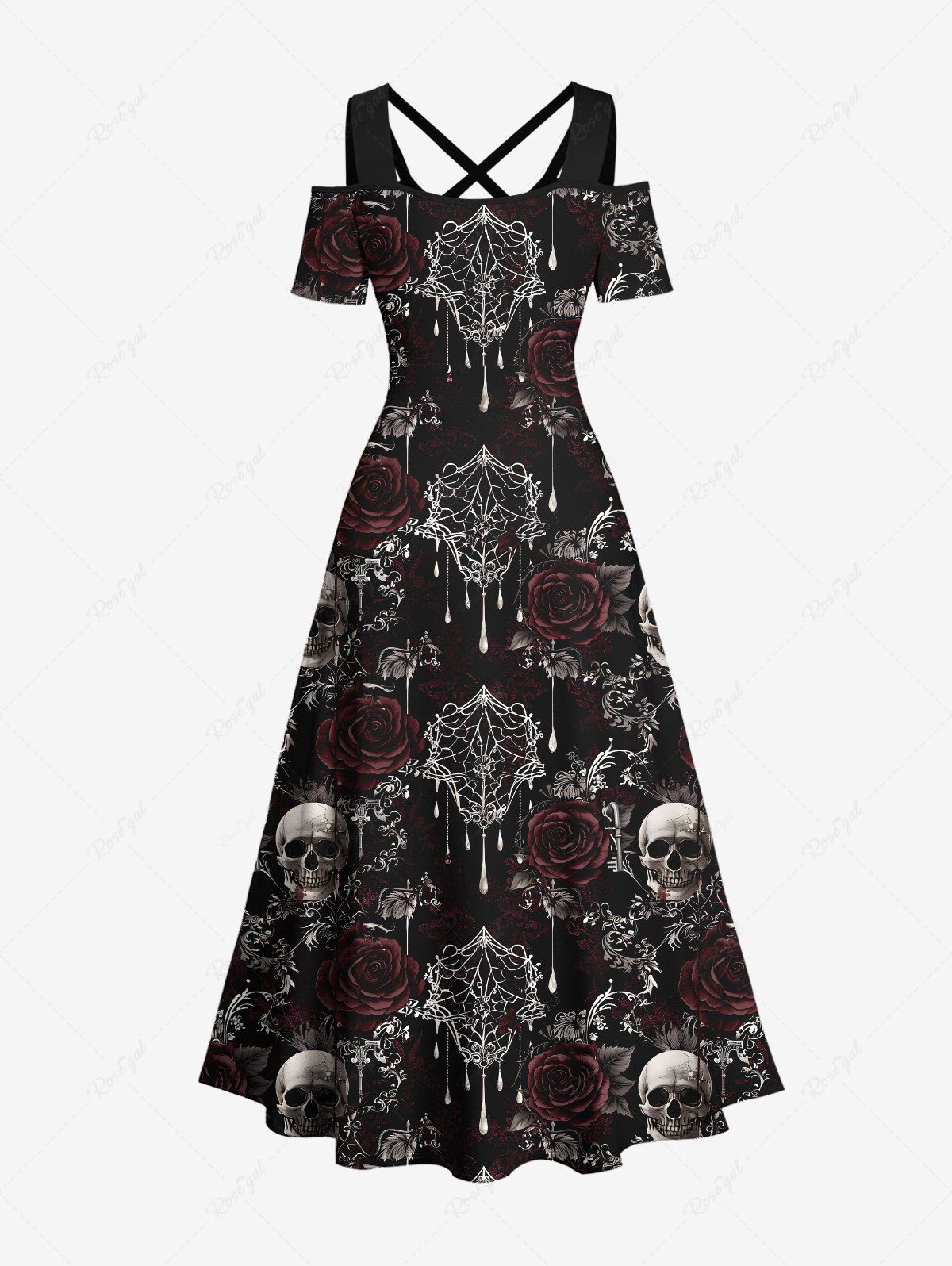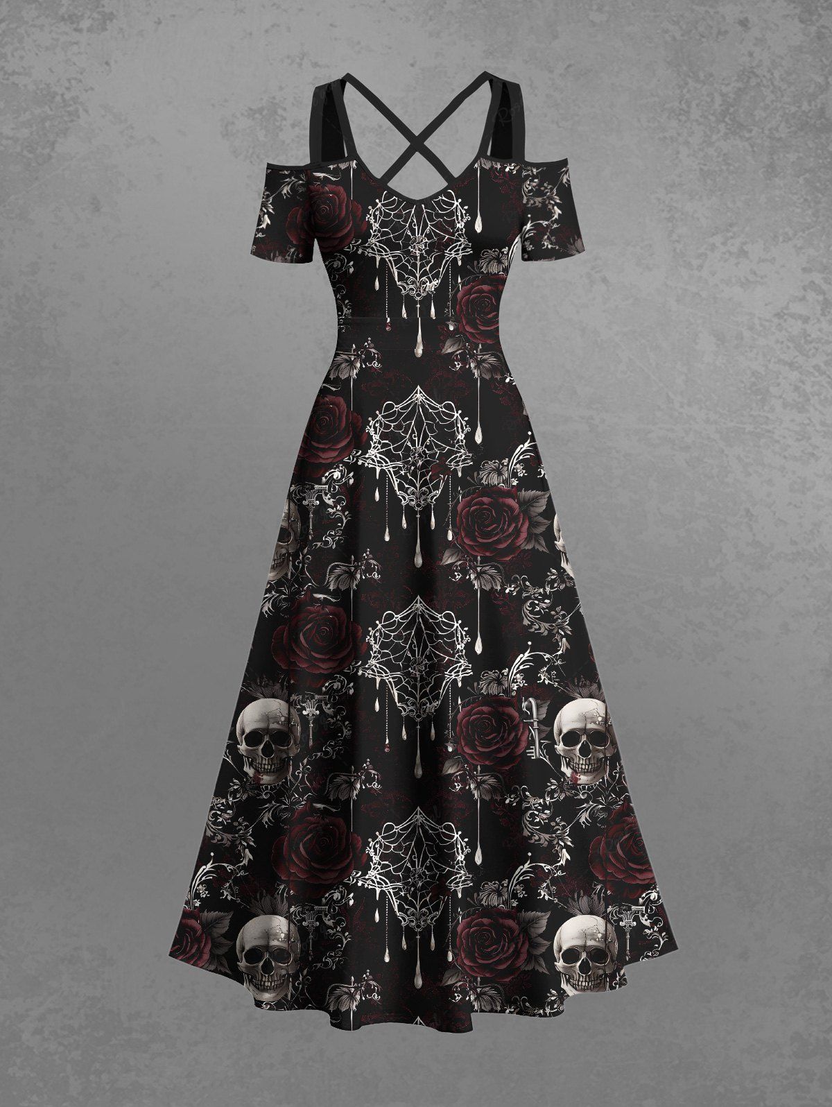 Gothic Plus Size Halloween Skulls Rose Flower Spider Web Print Cold Shoulder Crisscross Maxi Dress