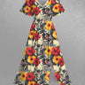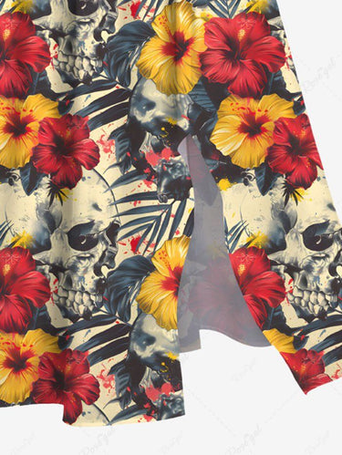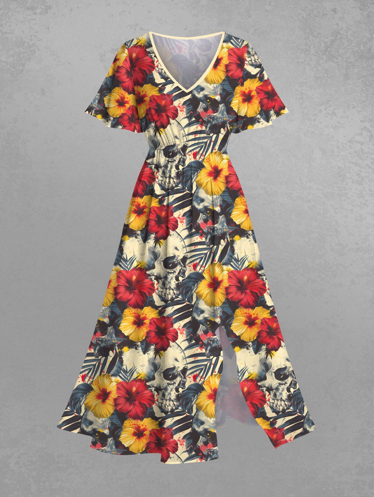 Gothic Plus Size Skull Tropical Leaf Hibiscus Flower Print Hawaii Split Pocket A Line Midi Dress