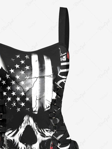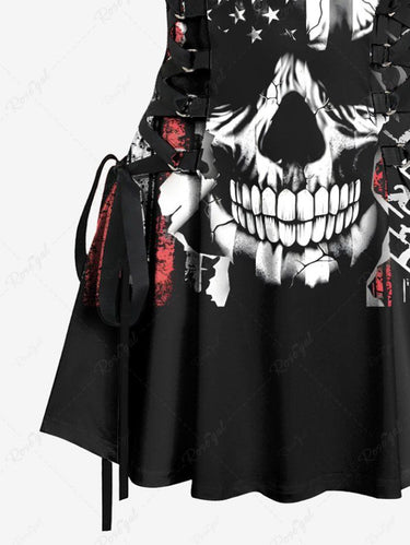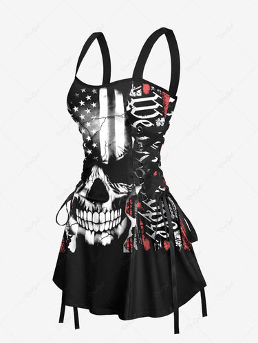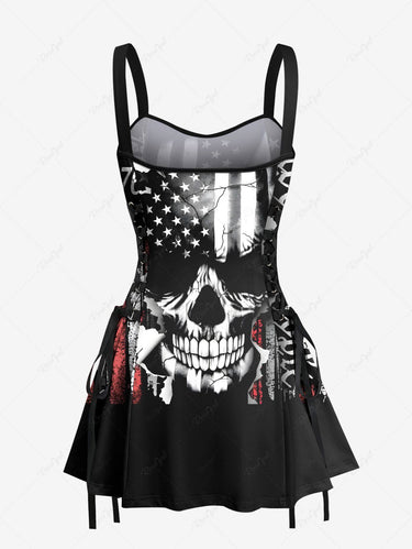 Gothic Skull Patriotic American Flag Print Lace Up A Line Tank Dress