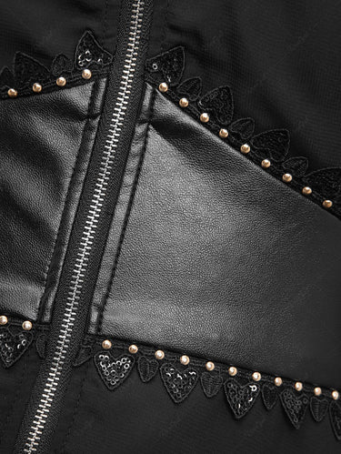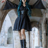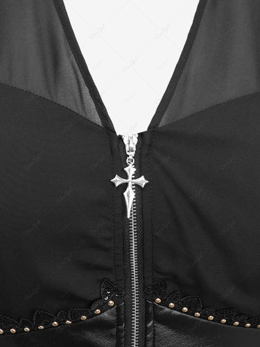 Gothic Plus Size Flare Sleeves Turn-down Collar Cross Half Zipper Lace Trim Layered PU Panel Corset Chiffon Solid Halloween A Line Dress