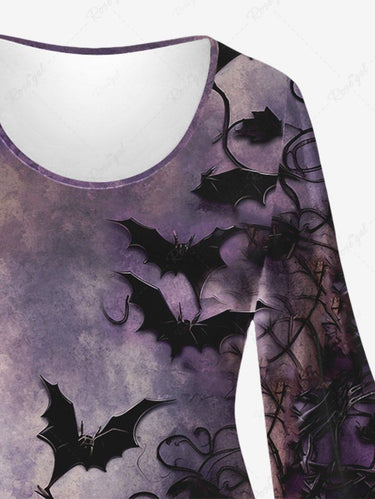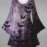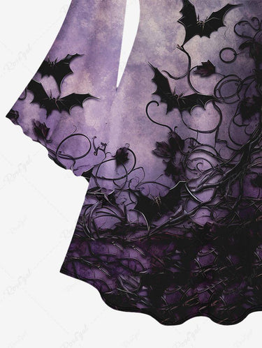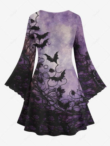 Gothic Plus Size Halloween Distressed Tie Dye Bat Vine Print Flare Sleeve A Line Dress