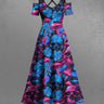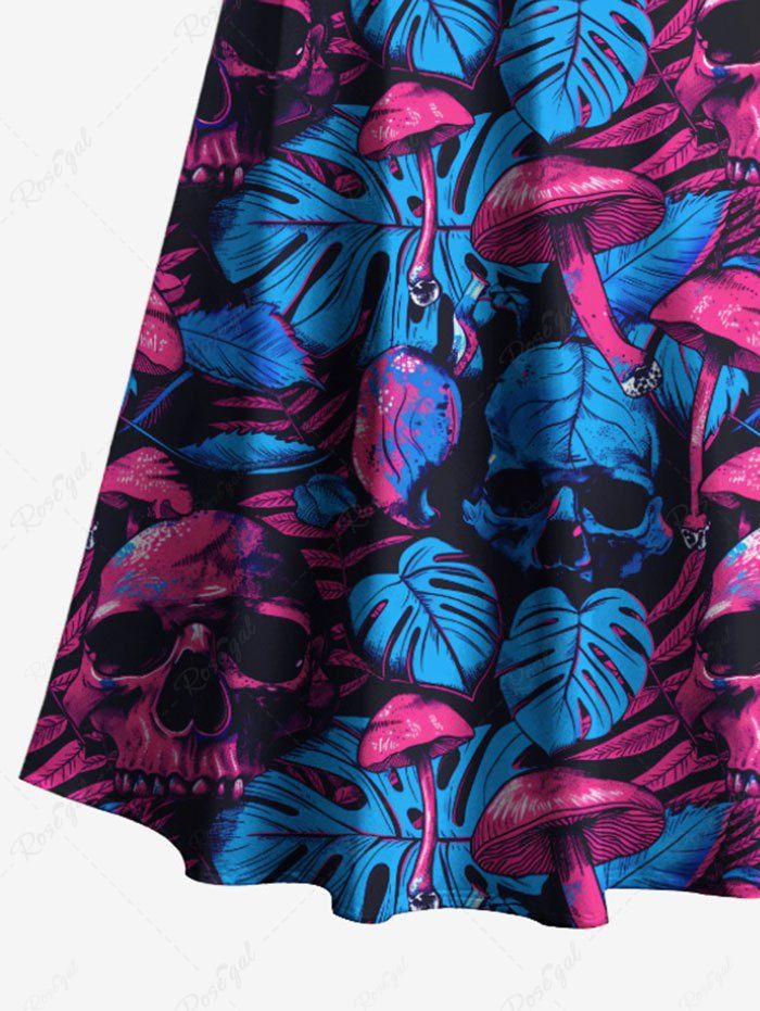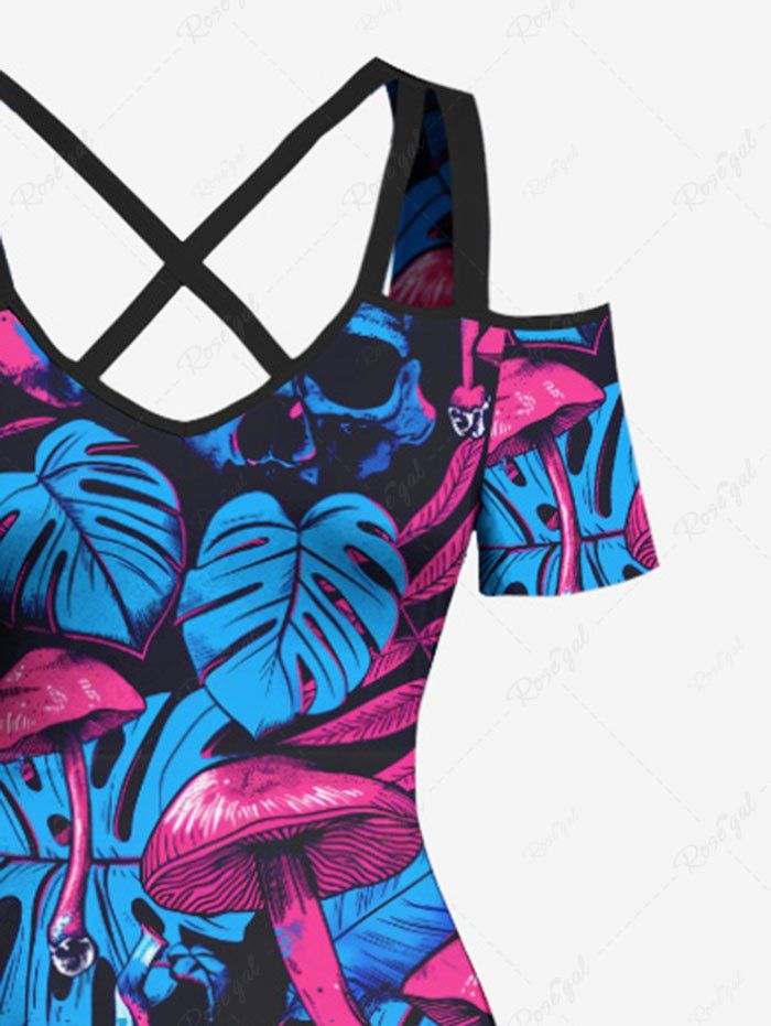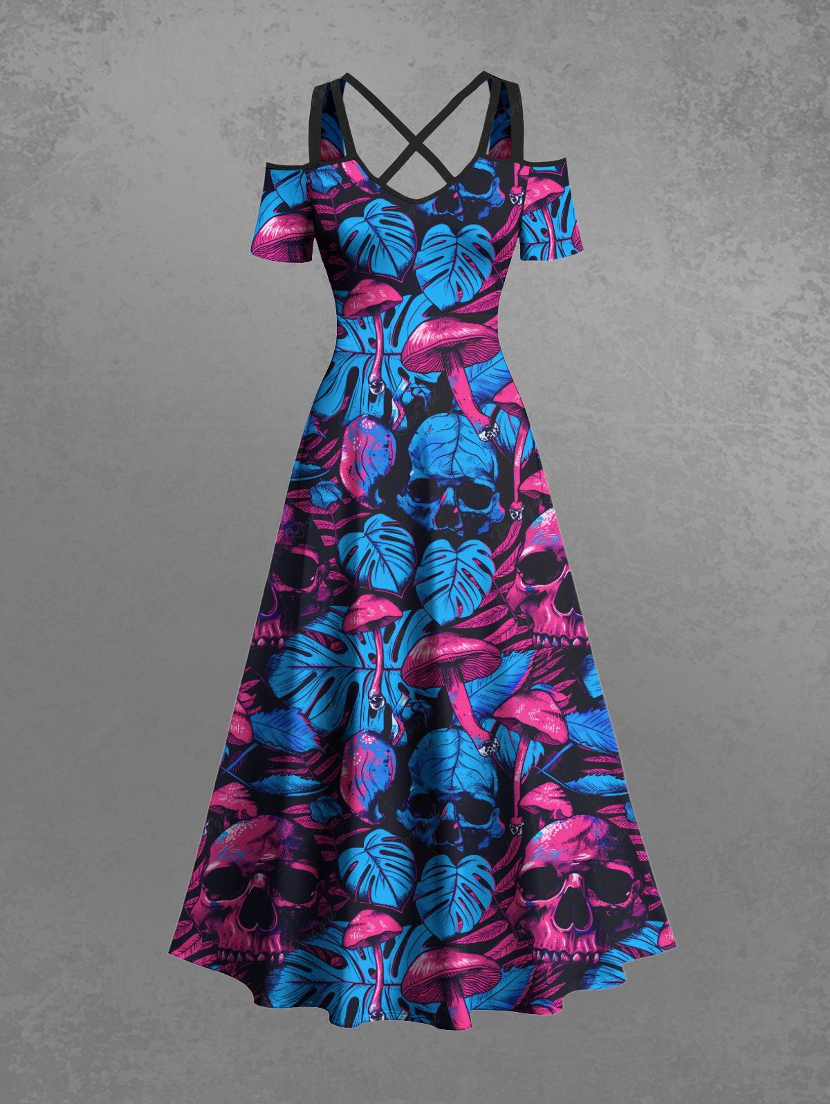 Gothic Plus Size Skull Mushroom Tropical Leaf Print Cold Shoulder Crisscross A Line Maxi Dress