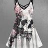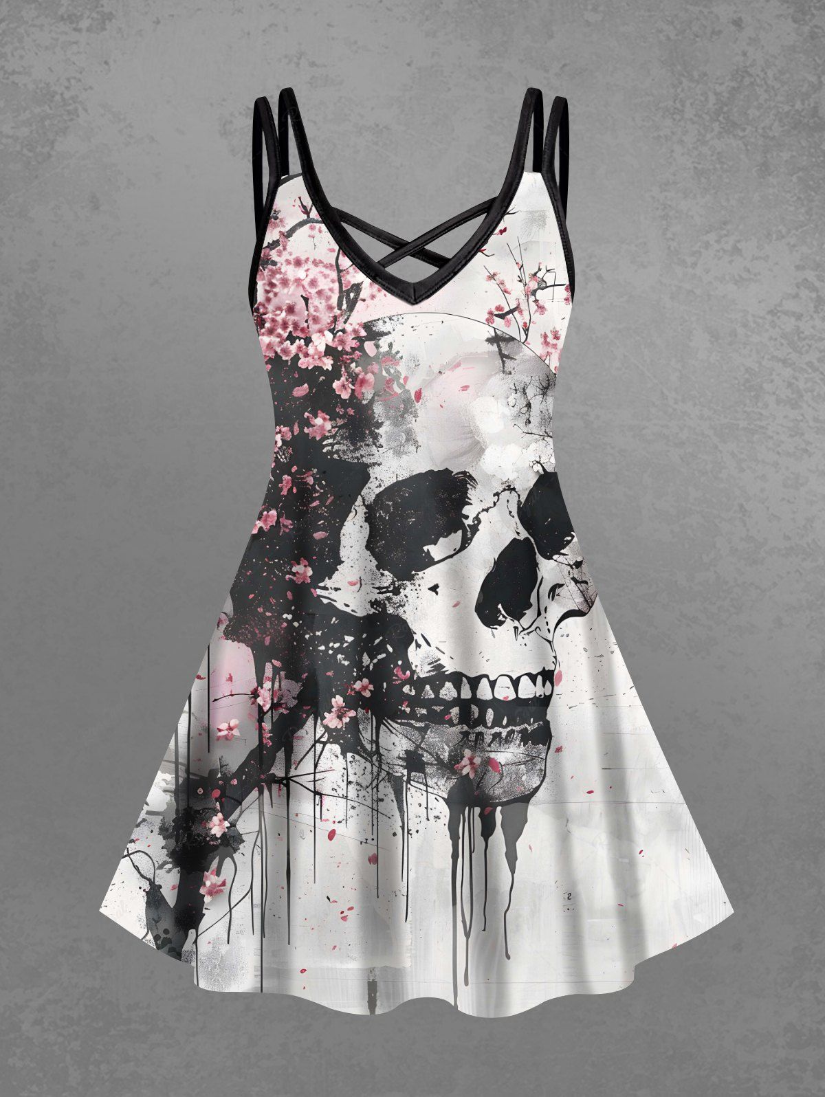 Gothic Plus Size Skull Peach Blossom Flower Ink Painting Print Crisscross Strappy A Line Cami Dress