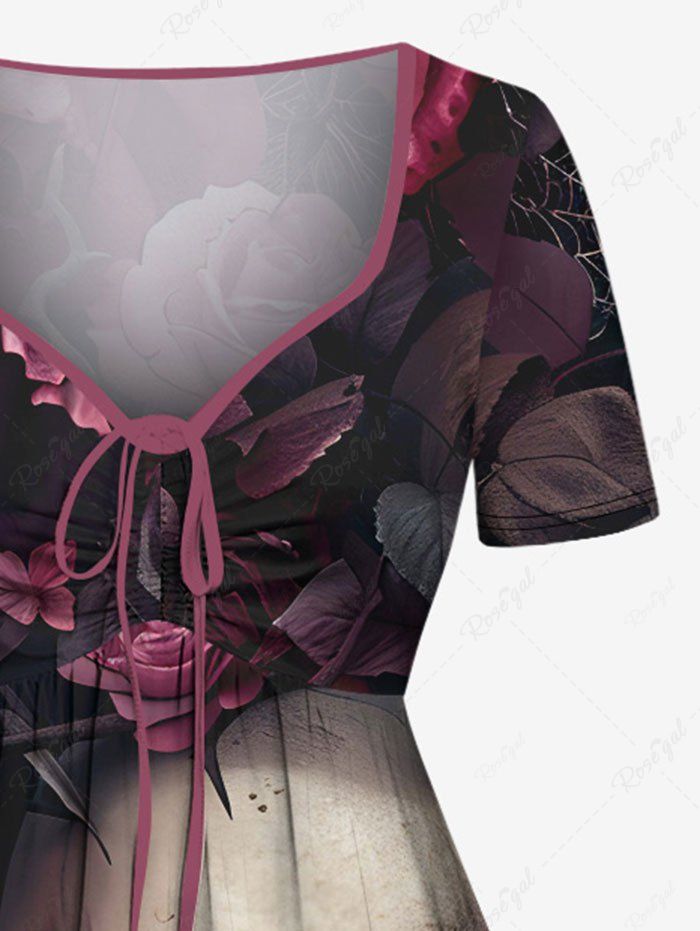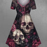 Gothic Plus Size Skull Rose Flower Print Cinched A Line Dress