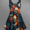 Gothic Plus Size Distressed Skull Rose Flower Fire Flame Print Crisscross A Line Cami Dress