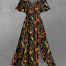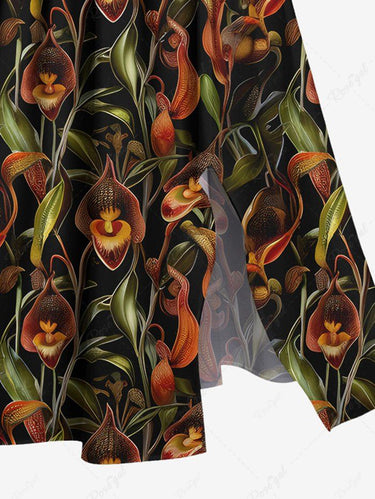 Gothic Plus Size Lily Flower Leaves Print Split Pocket A Line Midi Dress