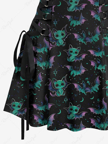 Gothic Plus Size Cat Ombre Bat Galaxy Print Halloween Costume Lace Up A Line Tank Dress