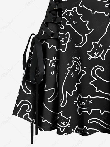 Gothic Cat Print Lace Up A Line Tank Dress