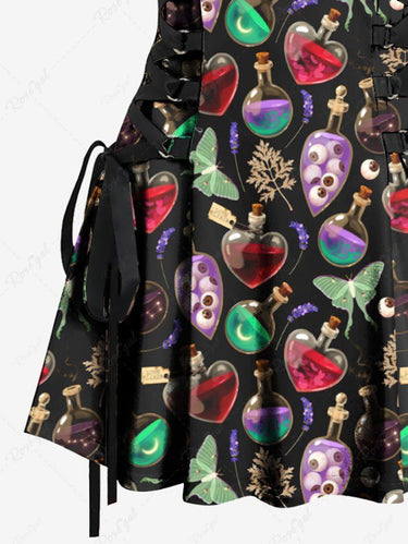 Gothic Colorful Alcohol Bottle Eye Butterfly Leaves Print Lace Up A Line Tank Dress