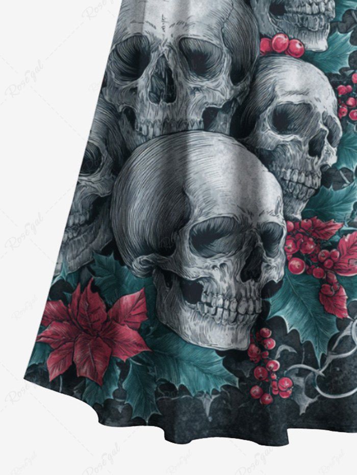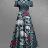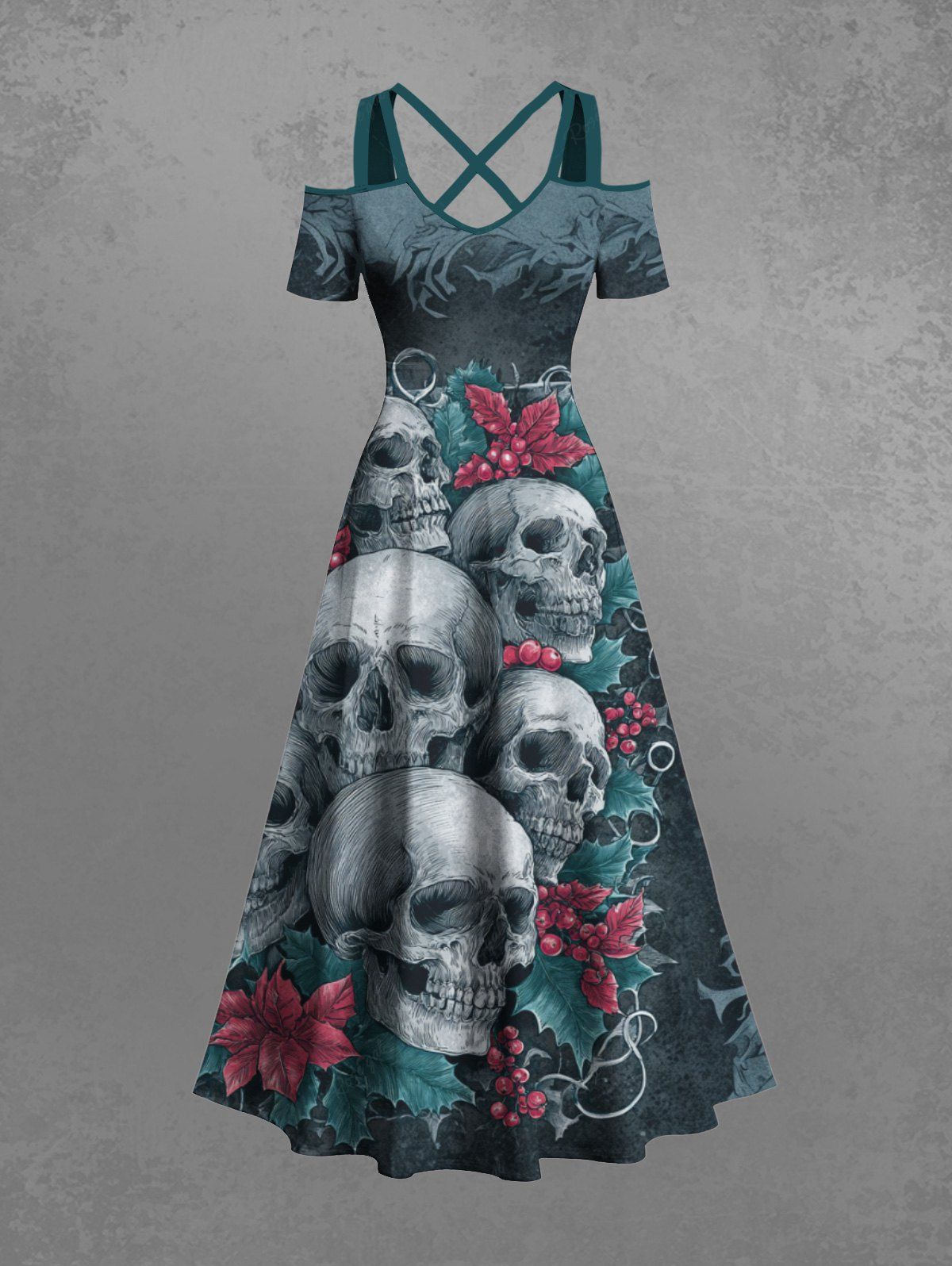 Gothic Plus Size Christmas Holly Leaf Skull Print Cold Shoulder Crisscross A Line Maxi Dress