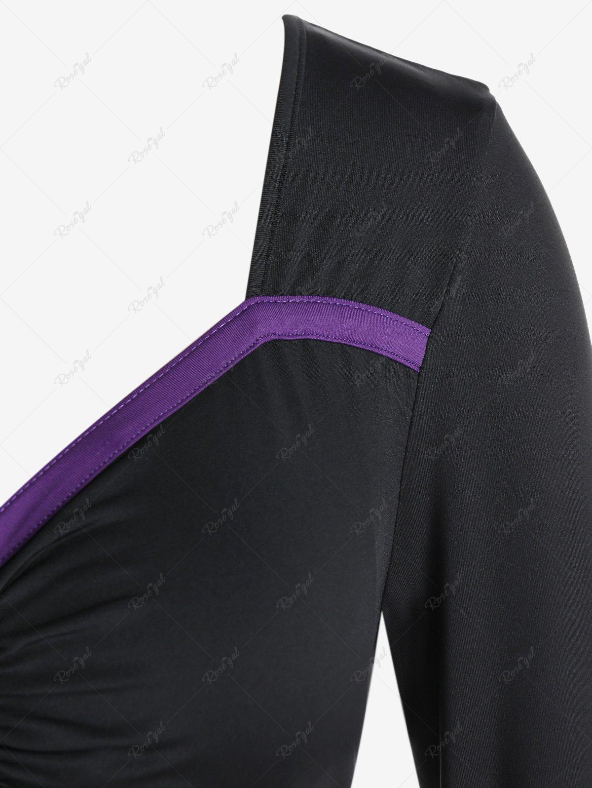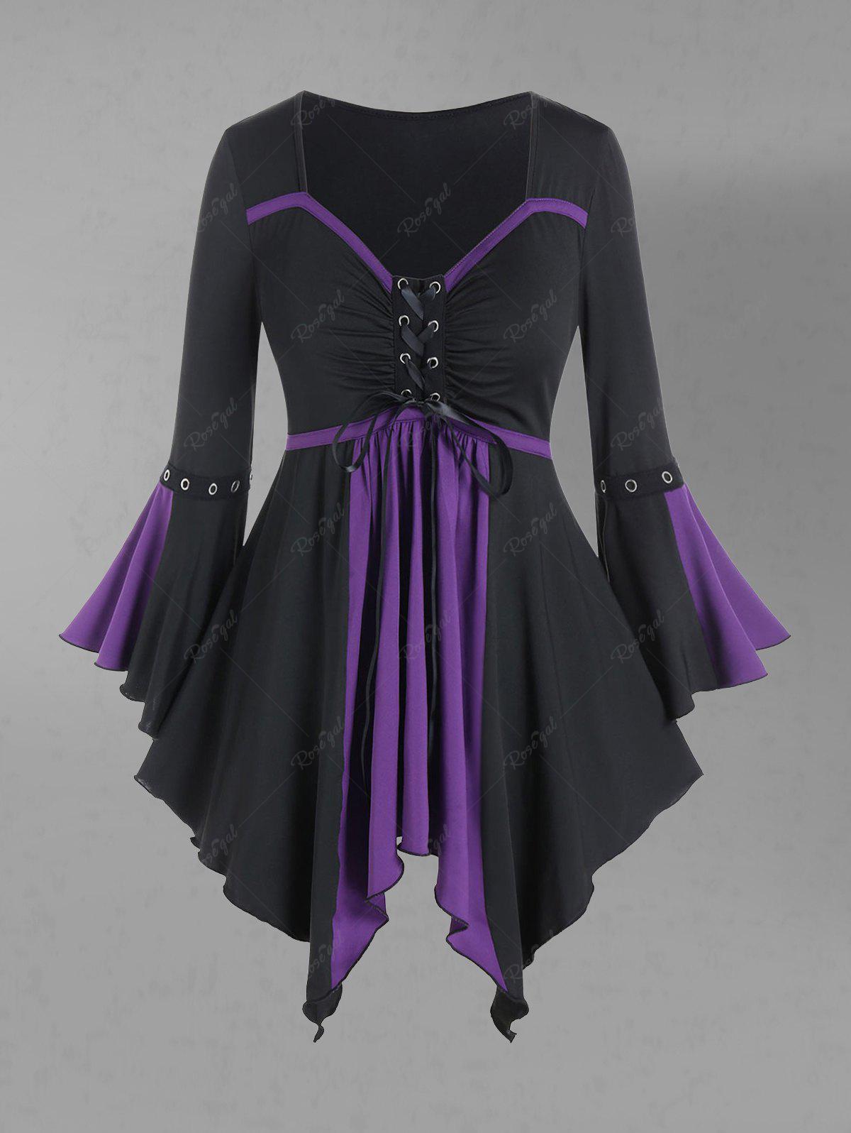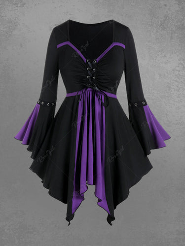 Gothic Plus Size Flare Sleeves Lace Up Contrast Hanky Hem Halloween Tee