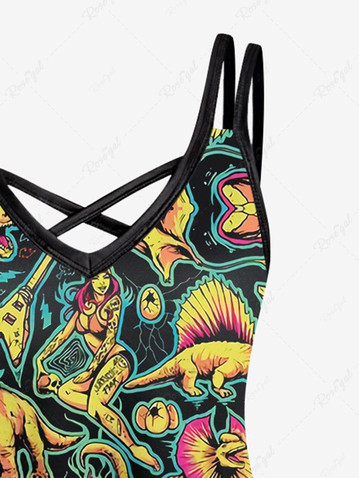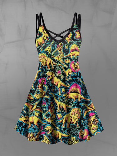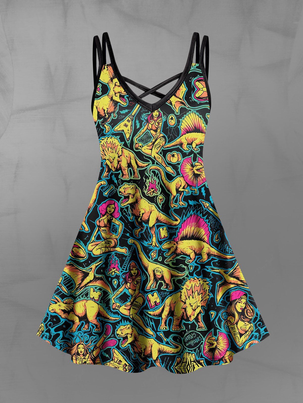 Gothic Plus Size Dinosaur Girls Fire Flame Print Crisscross Cami Dress