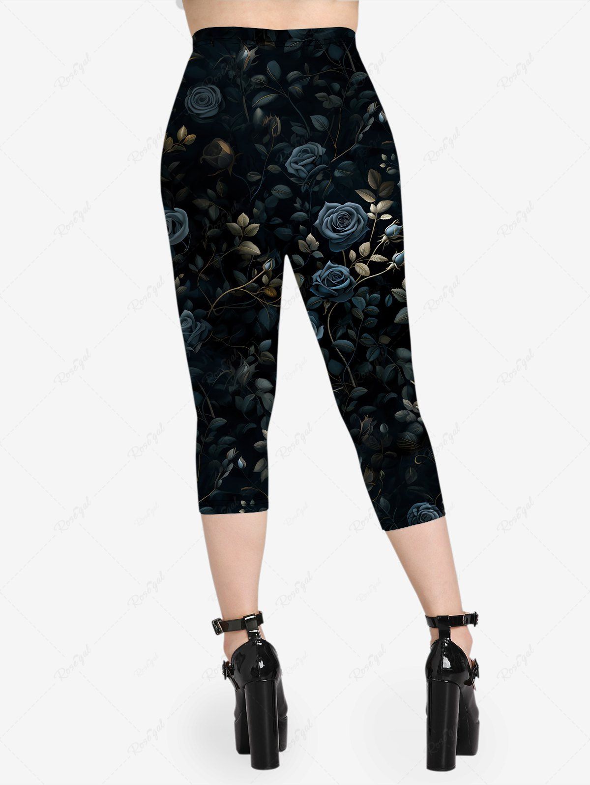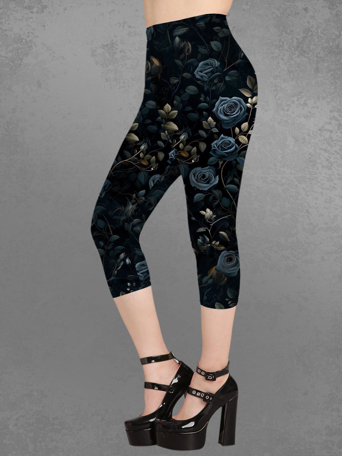 Gothic Plus Size Ombre Rose Flower Leaf Print Pocket Capri Leggings
