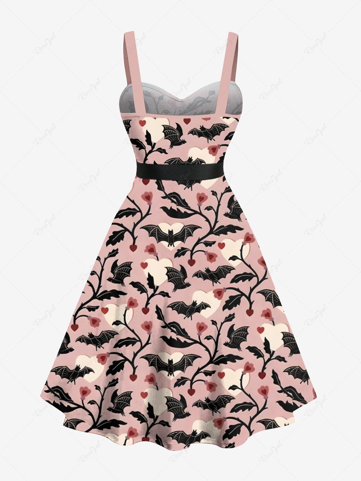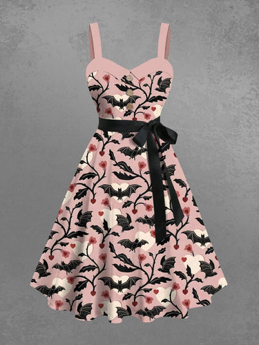Gothic Plus Size Bat Heart Flower Branch Print Button A Line Dress with Removable Belt