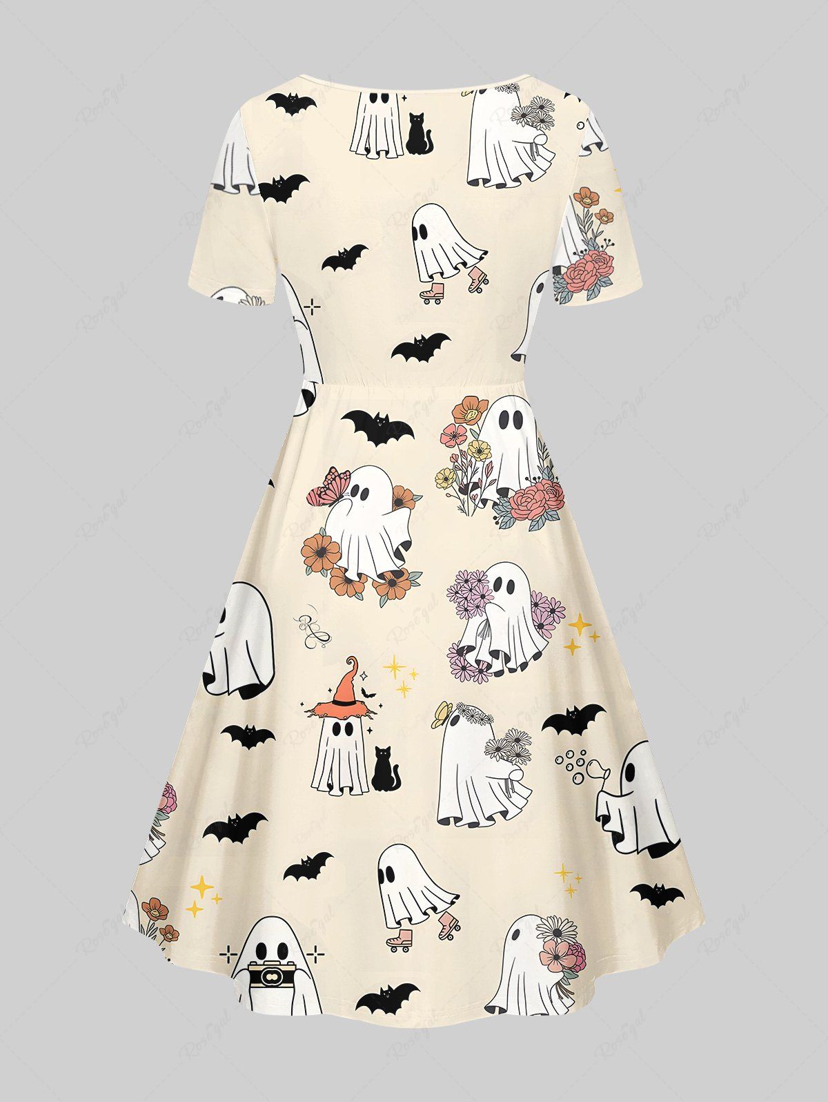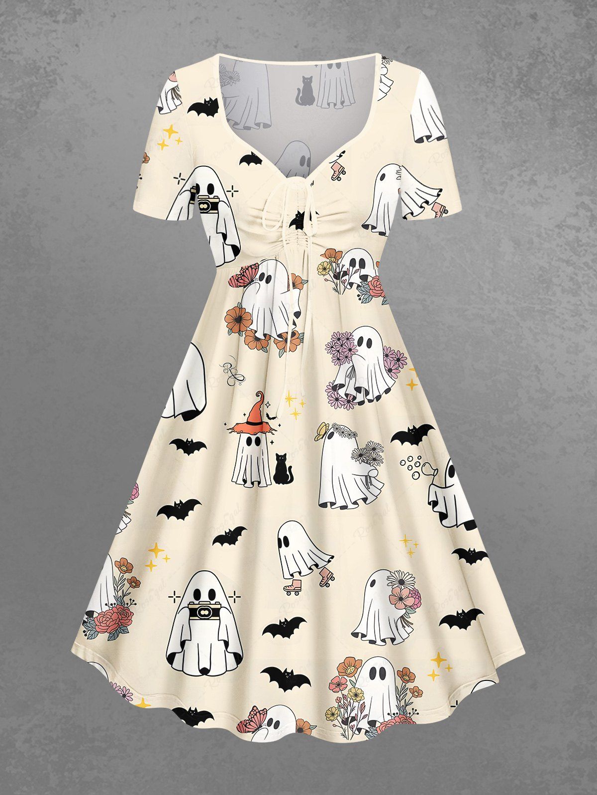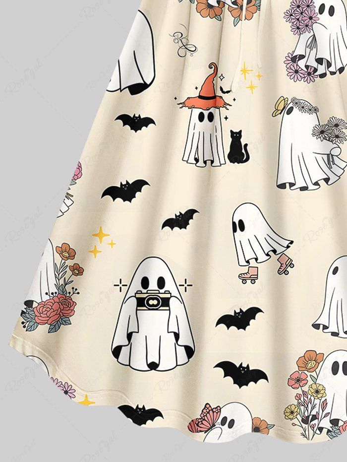 Gothic Plus Size Cute Ghost Bat Cat Flower Print Halloween Costume Cinched A Line Dress