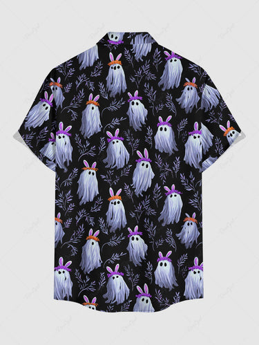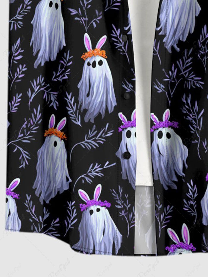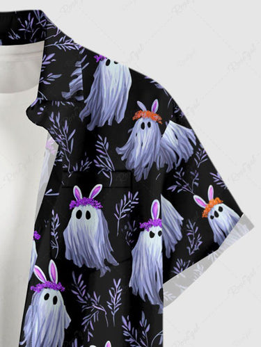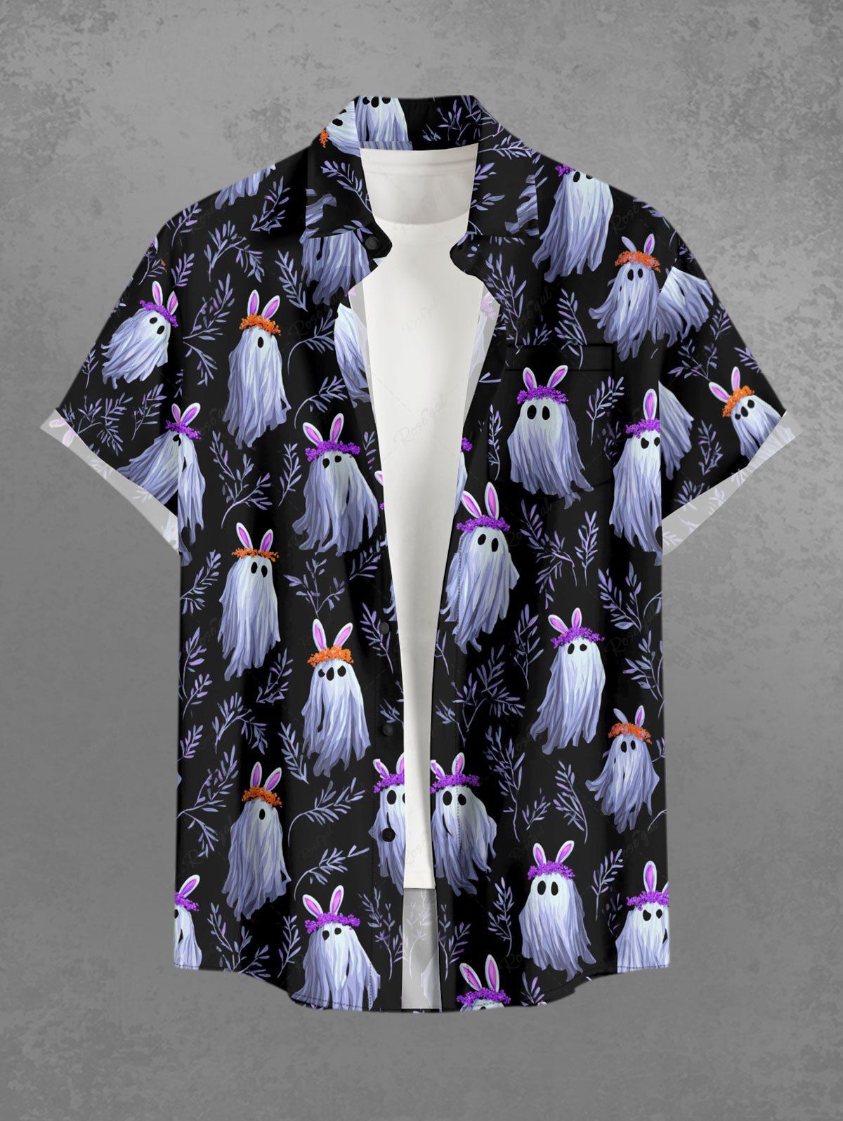Gothic Plus Size Cute Ghost Rabbit Leaf Branch Print Easter Button Pocket Shirt For Men