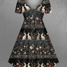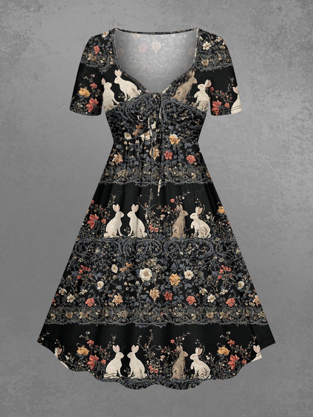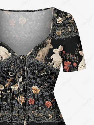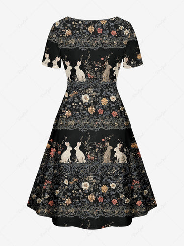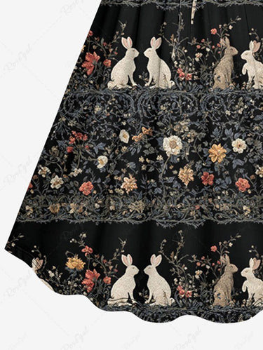 Gothic Plus Size Rabbit Flower Print Easter Cinched A Line Dress