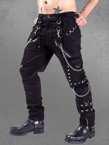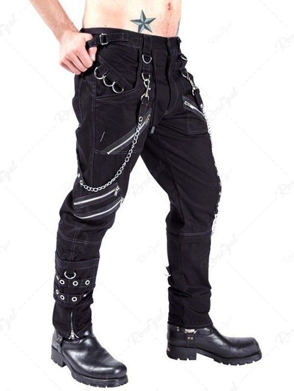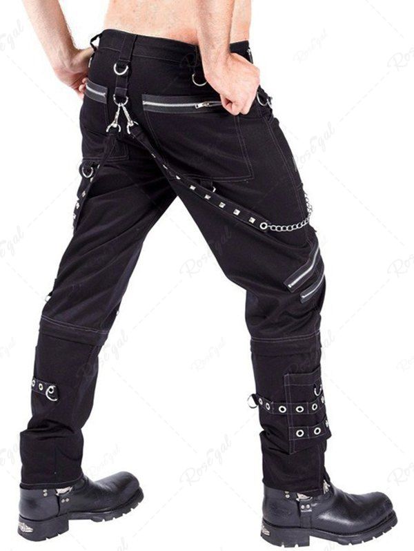 Gothic Punk Rock Chain Zipper Grommet D-Ring Pocket Topstitching Casual Pants For Men