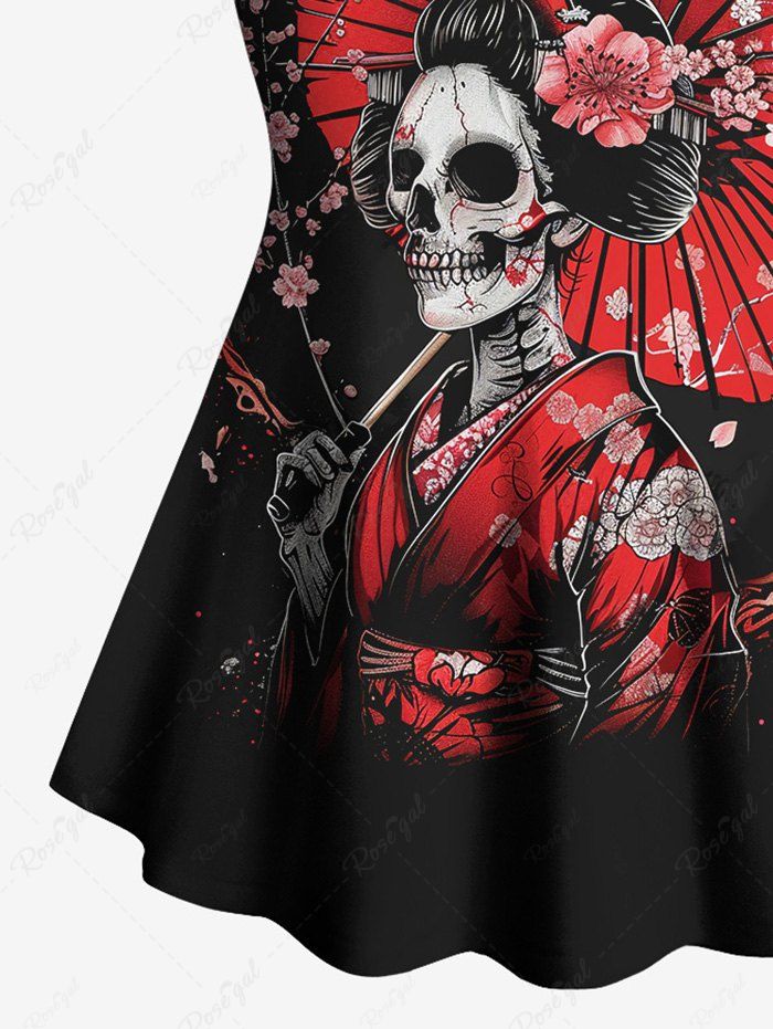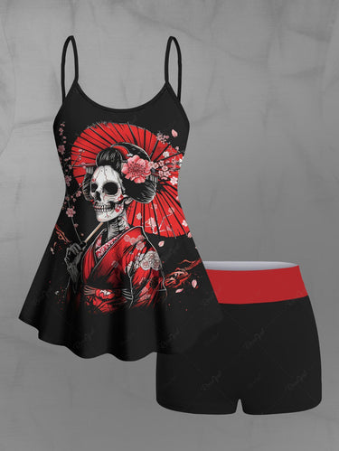 Gothic Plus Size Skull Songstress Umbrella Floral Print Boyleg Tankini Swimsuit (Adjustable Shoulder Strap)