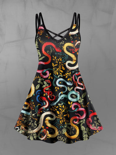Gothic Plus Size Snake Floral Leaves Print Halloween Costume Crisscross A Line Cami Dress